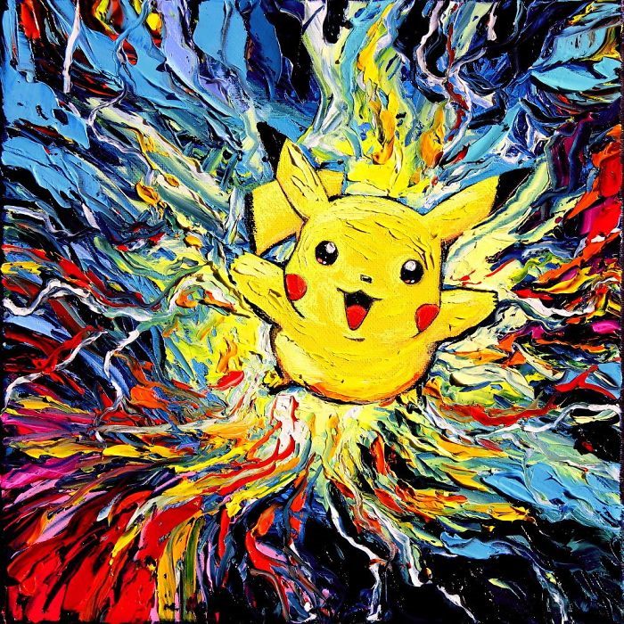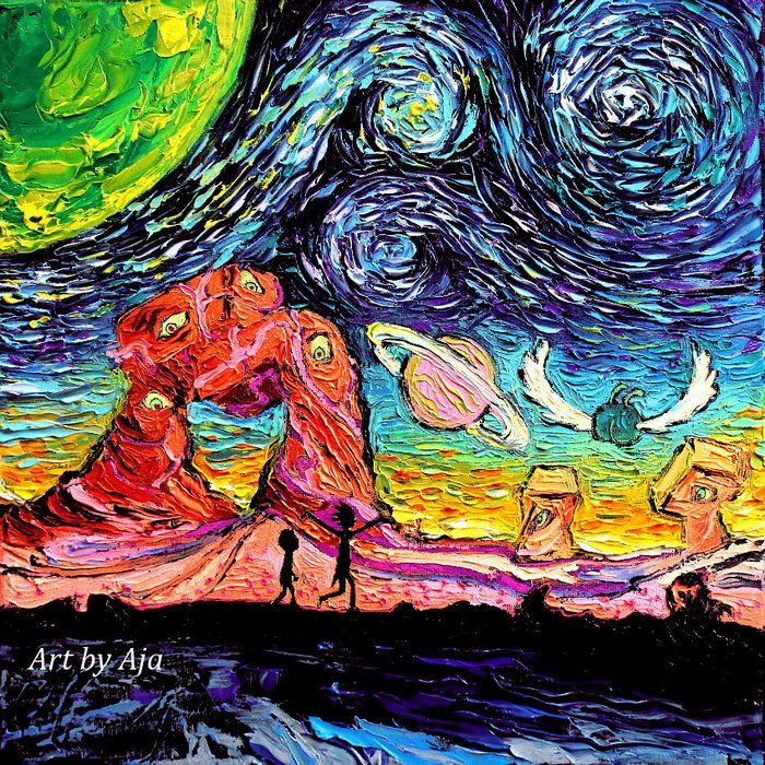 Il risultato è un pieno di umorismo e tenerezza, piacevolmente poetico ed infantile ed avvicina l’opera anche ai più piccini: personaggi come Il Re Leone, Spongebob , Winnie Pooh, Pokemon compaiono nelle sue opere mentre ammirano il firmamento visto attraverso gli occhi del celebre pittore olandese Vincent Van Gogh.
