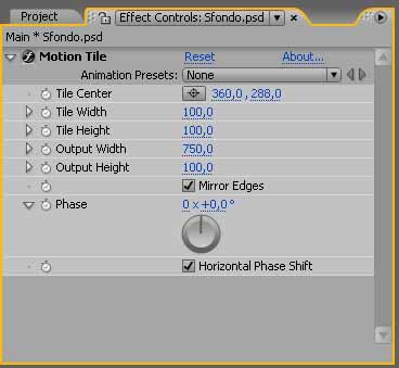• Applicare il plugin MotionTile (disponibile di default in Adobe After Effects) al layer “Sfondo”, impostando i parametri come in figura (clcca per zoom). In questo modo andremo a coprire i punti vuoti generati dal movimento di telecamera.
